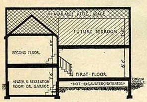 The split-level takes three basic forms: a home with two levels of living space (there is generally a third level, but it does not contain living space, instead housing a garage or a utility room), a home with three levels of living space, and a home with four levels of living space—all separated by less-than-full-height staircases. The earliest iterations tend to contain two or “two-quasi-three” levels of living space. The Concord, offered by Sears and discussed above, is a good example of this. The house contains two main levels of living space, separated by half-stair while the “quasi” third level contains a basement which the buyer could use as either a recreation room or as a garage. It is interesting to note that, even in 1933 when this home debuted, a fourth level was contemplated: should the family grow large enough and require additional space, there was an attic space above the main living level that could be converted to another bedroom (see Figure 11).