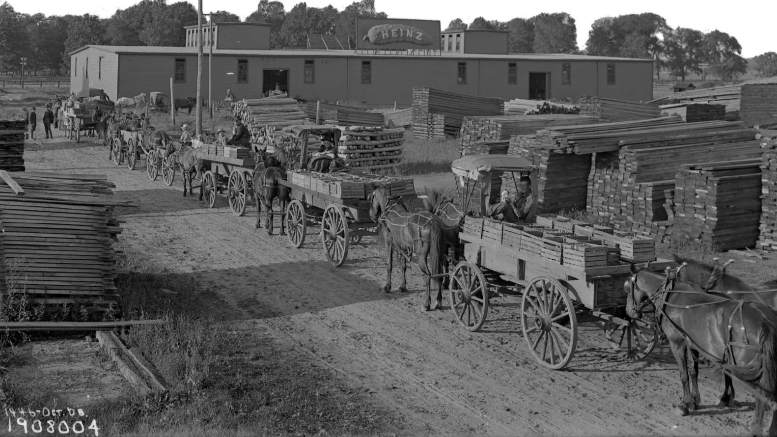 “Line of horse-drawn wagons containing cucumbers,” H.J. Heinz Company, Photographs, 1864-1991, MSP 57, Library and Archives Division, Senator John Heinz History Center.