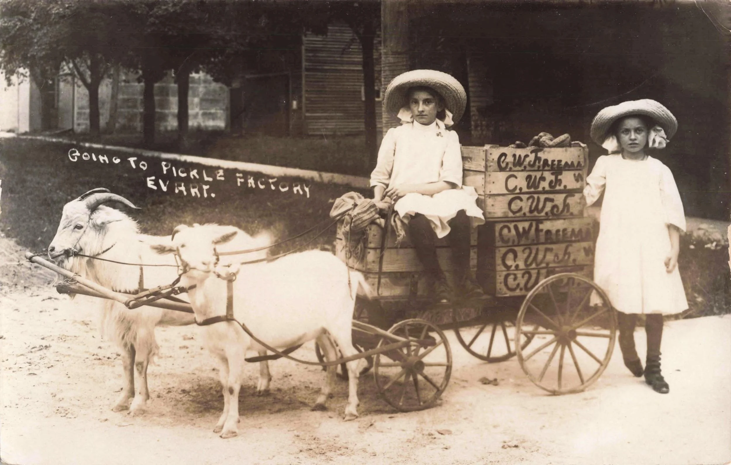 Instead of horses, these two girls use goats to pull their small wagon to the Heinz salting station in Evart.